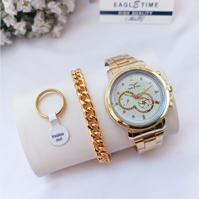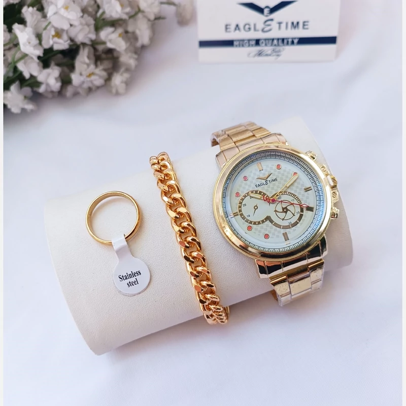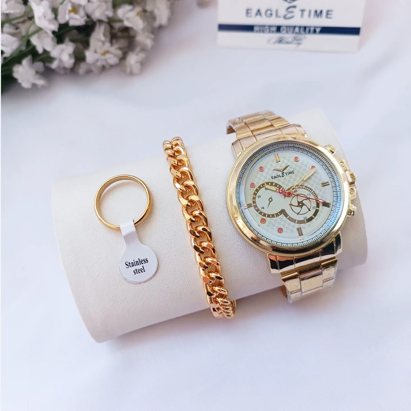 قیمت و خرید ساعت مچی مردانه دستبند انگشتر رینگی ست طلایی